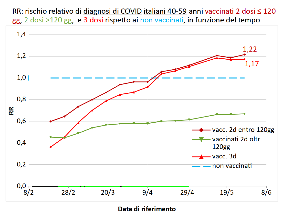 Per finire, la negativizzazione della VE rispetto all’infezione, evidentissima in Inghilterra nel trend dalla settimana 36/2021 alla 13/2022 (ultima pubblicazione di quei dati), anche in Italia non si limita ai bambini, ma si sta presentando anche in altre classi d’età. Ad esempio, ecco, nella figura 1 la situazione dei 40-59enni nei dati ISS.